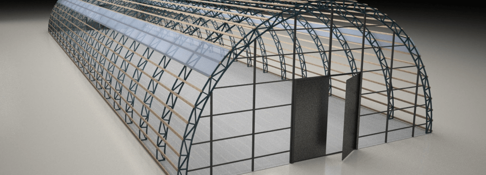 По форме напоминают ангары шатрового типа, но есть отличия по конструкции арок. Это вписанные в эллипс плоские фермы в виде решёток либо двутавровые балки, которые соединяют болтами. Используются в качестве крытых автостоянок и автосалонов, производственных помещений, склада.